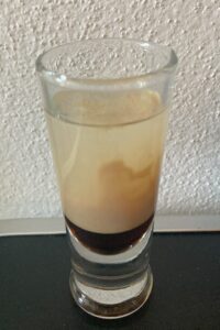 - Con ayuda de una cuchara servir 12.5 ml de Baileys en una segunda capa y 12.5 ml de Cointreau en una tercer capa.